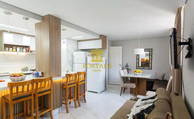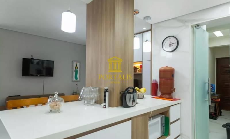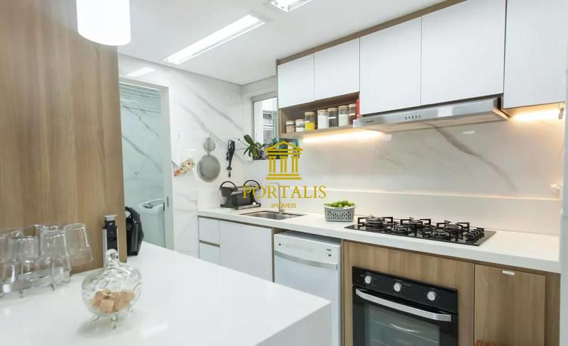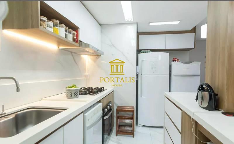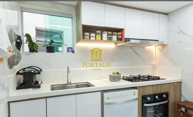Cozinha planejada, integrada com a sala, com piso em porcelanato