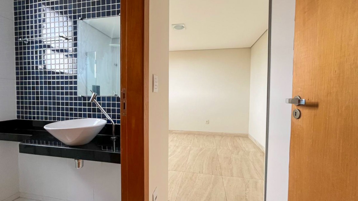 1 Quarto amplo, com armários e piso em porcelanato, sendo a suíte com bancada em granito, pia em cuba de apoio, espelho e box em blindex